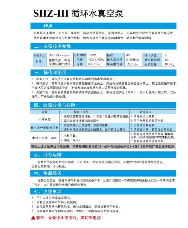 電機(jī)功率:180W電壓:~220v/50Hz流量60L/min楊程8M最大真空度0.098Mpa單頭抽氣量10L/min抽氣頭數(shù)量:2儲(chǔ)水箱容積:15L材質(zhì):整機(jī)外殼、泵殼、葉輪、采用防腐PP材料。外形尺寸:40*39*45cm