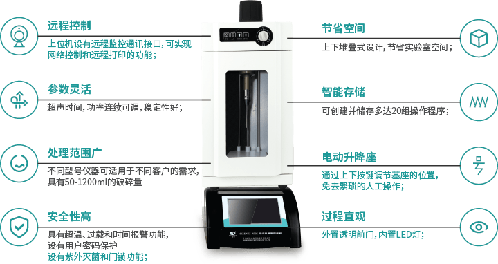 • 處理范圍廣 不同型號(hào)儀器可適用于不同客戶的需求,具有50-1200ml的破碎量