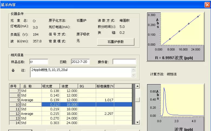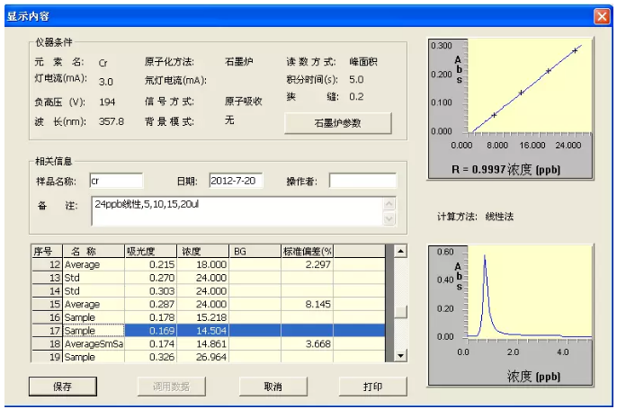 2、試樣測(cè)定:分別吸取試樣液和試劑空白各20 μl,注入石墨爐,測(cè)得其吸光度代入標(biāo)準(zhǔn)線性回歸方程中求得試樣中鉻含量。