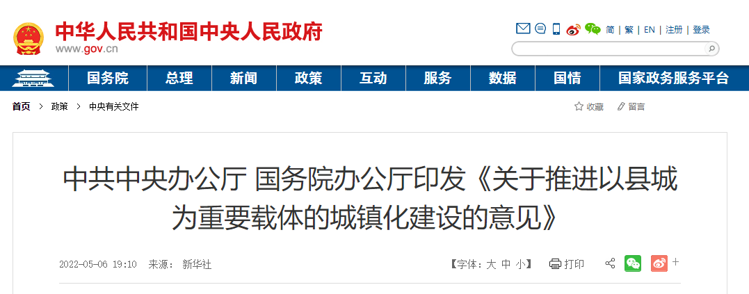 5月6日,中共中央辦公廳、國務院辦公廳印發(fā)了《關于推進以縣城為重要載體的城鎮(zhèn)化建設的意見》,并發(fā)出通知,要求各地區(qū)各部門結合實際認真貫徹落實。
