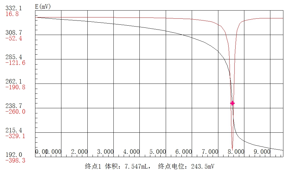 測試過程:稱取10g試樣,精密稱定,置于滴定杯中,加50mL水溶解后,加2mL磷酸溶液、5mL碘化鉀溶液。充分混勻,用硫代硫酸鈉標(biāo)準(zhǔn)滴定溶液(0.002mol/L)在自動滴定儀上滴定至終點。